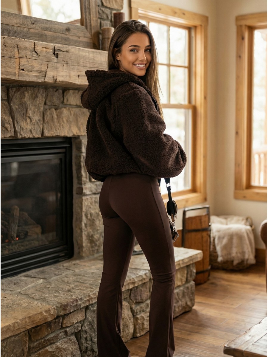 The flared-leg design visually elongates the legs and slims the silhouette, while the elastic waistband ensures complete freedom of movement and all-day comfort.
