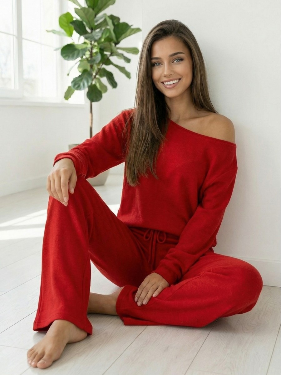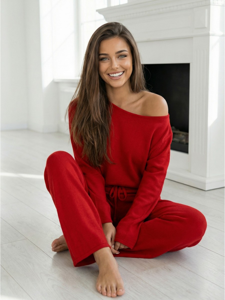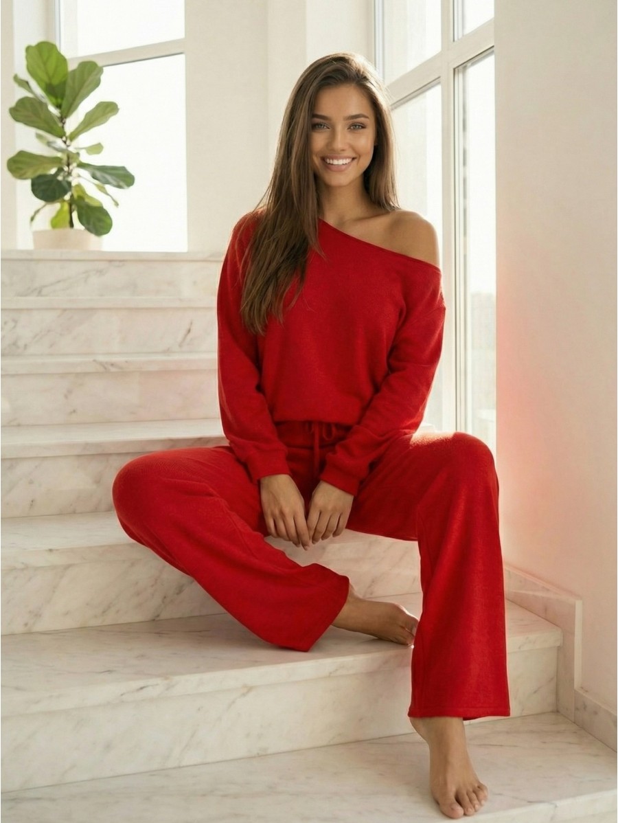 The loose off-shoulder top and tie-waist pants create a stylish, feminine look perfect for chilly days at home or a walk outside.