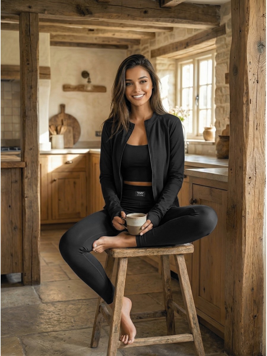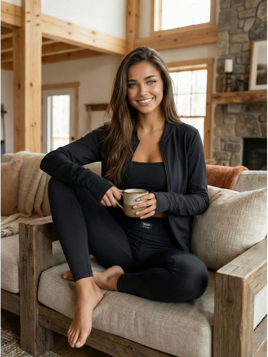 The top, leggings, and zip-up jacket made from ultra-soft, elastic fabric perfectly contour the body, highlighting your silhouette while offering unmatched comfort.
